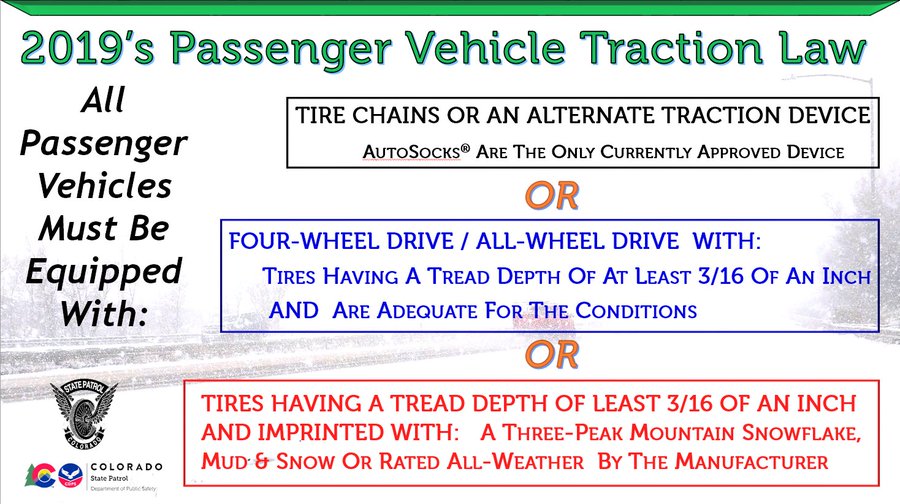 Colorados CHAIN LAW REQUIRES Commercial Vehicles to have Tire Chains or an approved traction device in the vehicle from Sept. October 17 2022. October 4 2022 - 8am 4pm.
